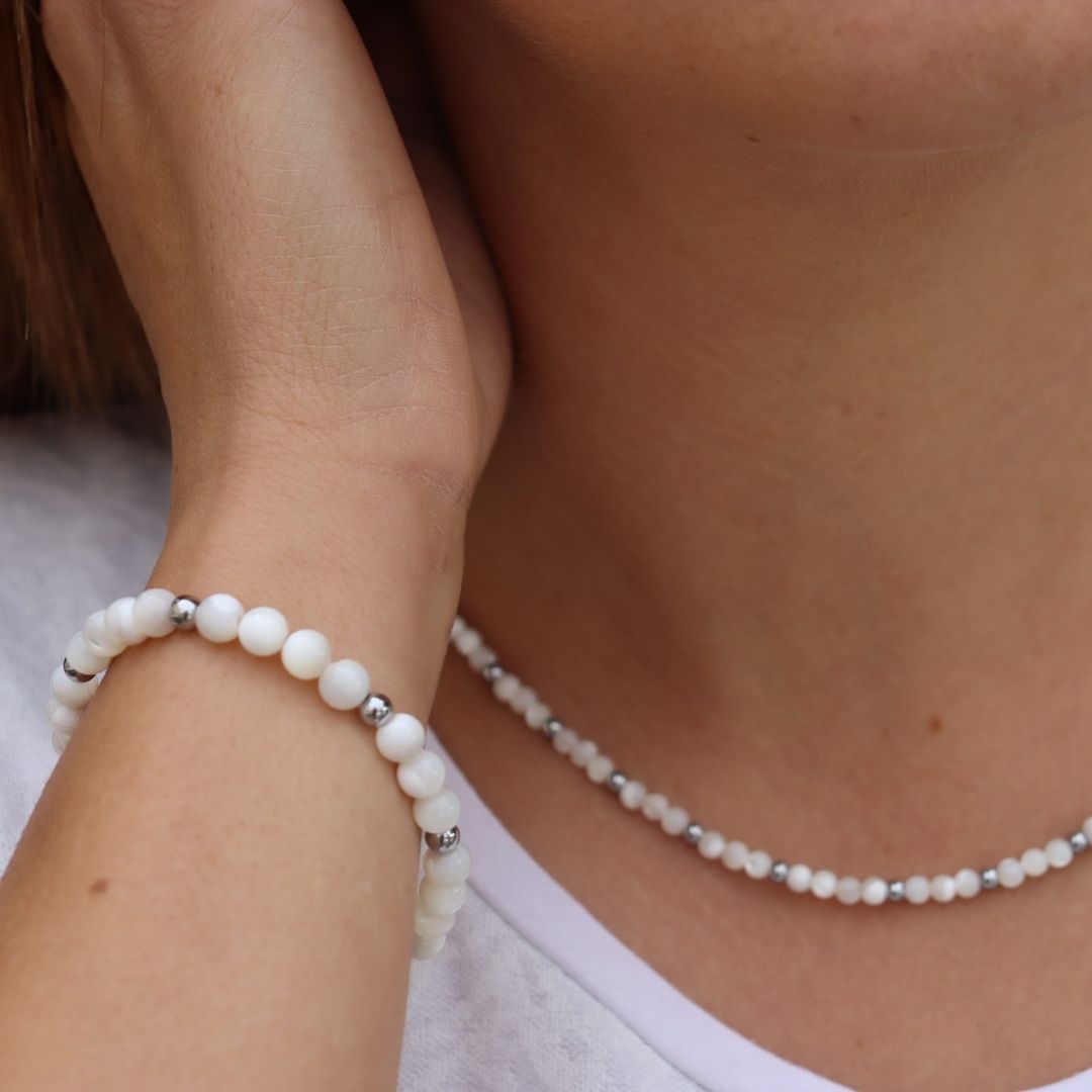 La nacre blanche, issue des coquillages marins, incarne la pureté et la douceur.